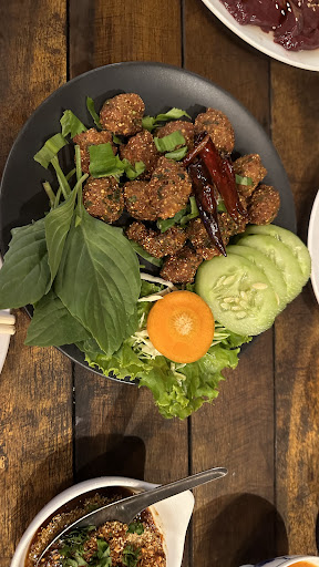 ประเด็นคือเราเจอร้านนี้จาก stories ของพี่ในไอจีตอนประมาณสามทุ่มใช่แล้วเราเห็นตอนสามทุ่มแล้วเราก็อยากกินมากเลยก็เลยชวนเพื่อนเพื่อนซึ่งไม่มีใครมาด้วยมีอยู่คนเดียวก็คือพี่เรา และนางก็คือขาเจ็บจ้าแต่ก็ต้องตามน้องสาวอ่ะเนาะ ประเด็นคือขนาดไปประมาณสี่ห้าทุ่มอ่ะร้านก็ยังเปิดแล้วเค้าบริการดีมากเพราะว่าเราเป็นตัวสุดท้ายของร้านเลยก็ว่าได้คือเค้าจะปิดแล้วแหละแต่ว่าเห็นว่าพวกเรามาก็เออบริการต่อแล้วเค้าบริการน่ารักไม่แบบไม่ไม่ไล่ไม่มีพฤติกรรมอะไรที่แบบรู้สึกว่ารีบกินแล้วรีบกลับอ่ะเราก็นั่งชิลล์กันต่อได้อ่ะ เมนูเค้าก็มีเยอะมากแล้วน้องเค้าก็จะบอกว่าอะไรหมดบ้างอะไรมีบ้างเพราะว่าเราไปตัวสุดท้ายใช่ไหมเราก็อยากกินลาบทอดแล้วก็สั่งลาบทอดแล้วก็จิ้มจุ่มซึ่งเป็นการมาครั้งแรกก็ลองก่อนปรากฏว่าจิ้มจุ่มคือดีดีแล้วอากาศตอนกลางคืน น่ะร้อนร้อนสุดซดไปคือฟินโดยเฉพาะน้ำจิ้มแจ่วถ้าได้ใส่มะนาวอีกนะคือจะบอกว่าปังมากอร่อยมากคือมันนัวมันเข้มข้นแต่แอบติดหวาน ส่วนลาบทอดอันนี้คือฉันมาเพื่อสิ่งนี้ ...