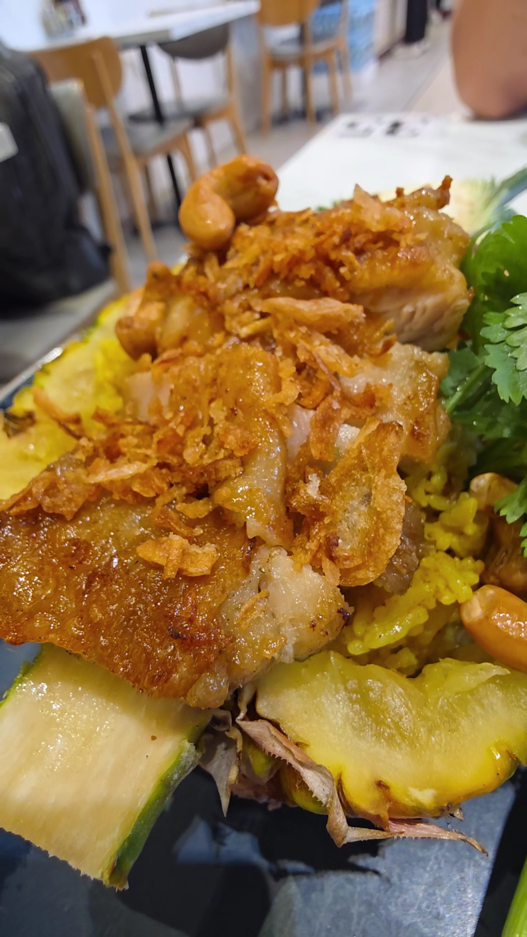We ordered Baked rice with Pineapple & Grilled Chicken, Pad Thai with grilled chicken, Crispy fried spring roll. Almond cake and Croissants for takeaway. I have tried several Baked rice with Pineapple in different Restaurants here in Thailand and I can say that this one is not that big but I like how flavorful the rice is, the grilled chicken on top is well marinated and properly cooked. The Pad Thai was good, noodles was not overcooked, though I prefer a bit more sour taste for my Pad Thai. The grilled chicken with it is just the same with the one in the Baked rice w/ Pineapple. The crispy fried spring roll was bigger than I expected, stuffed well with ingredients like veggies,herbs & vermicelli noodles, it's not salty but still taste good. Served with a sauce for dipping, it's very crunchy.