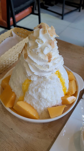 바나나스무디도 맛있었지만 망고빙수가 특히 인상적으로 한번쯤 먹어볼만 합니다. 자른 망고와 함께 찰밥까지 한 세트였어요.(259THB) 풍성한 크림 아래에 우유빙수가 있고 그 안에 망고와 크루통이 들어있는데 맛있었습니다.