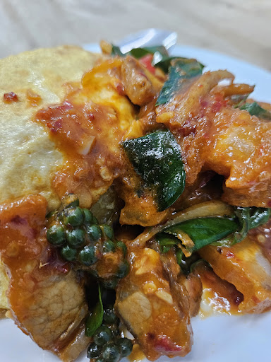 ทันทีที่จานเสิร์ฟมา กลิ่นหอมของพริกแกงแดงตำสด ๆ ก็ลอยมาแตะจมูก เสริมด้วยใบมะกรูดฉีกและกระชายซอยที่ผัดรวมกับหมูกรอบชิ้นโต หน้าตาเย้ายวนเกินห้ามใจ จุดเด่นของจานนี้คือ หมูกรอบ ที่กรอบนอกนุ่มใน หนังยังคงความกรุบแต่ไม่เหนียว ผัดกับพริกแกงจนเคลือบทั่วแต่ไม่มันเยิ้ม จานนี้ให้ความเผ็ดร้อนแบบถึงใจ พร้อมกลิ่นหอมจากเครื่องแกงที่ไม่หวงเครื่องเลยแม้แต่น้อย ฉันสั่งไข่เจียวมาด้วยกินคู่กันแล้วเข้าสุดๆ