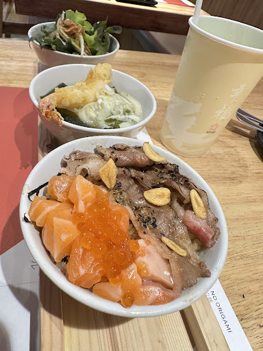 Read moreJapanese restaurant style, decorated like Japan garden. Have a sakura tree at the centre of the shop. Premium Wagyu-Don Spicy Salmon Thai salad Premium Wagyu Roll Beverage mune refill 45 ฿ Crispy Fried Shredded Wonton Sheets **Complementary Overall, it was a good taste 😋 resonable price, quite cheap. ...