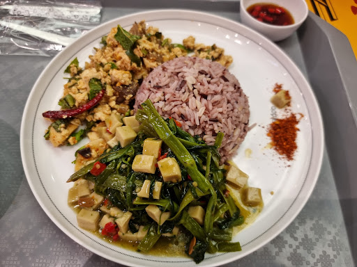 This is a long message, but if you're like me, a vegan cook, and have tried many places, this will convince you to go. I went with zero expectations. This trip, I just keep ordering food, then not finishing it. Much too often, too expensive as well! For example, I order curry or pad Thai and it's too greasy. So, I usually just order fresh spring rolls, and the restaurants give me bottled sweet and sour sauce as a dipping sauce, which is also so disappointing (I'm used to peanut sauces or tamarind...anything homemade)! Anyway, first, this place is in a food court. You have to get a prepaid card from card counter to orderdon't forget to return, to get money back. Second, I ordered mock chicken (which was steamed/sautéed tofu skin, which is one of my most favorite things in the world), with rice and fried dumplings. Third, for 150 baht, I think it's the cheapest meal I've had in two weeks, plus I actually ate it all. Fourth, they have chili vinegar/hot sauce available...(obviously without fish sauce), at the counter, so that's a win for me! And finally, fifth point...both dishes came with the right amount of dipping sauce. Yum yum, I might go there again. It's less than 45 min walk from Khaosan. I took a taxi scooter there (100 baht), but walked back (along the river, was really nice, at sunset). And bonus...not everything was deep fried. Plus, I am really sick of Buddhist vegetarian places (the buffet kind, no offense, I just can't personally eat at at them anymore. I've just had it too many times in Asia), so I was happy to see a new variety on this menu! A real treat! Bring your own drinks, fresh juice in the area (Siam) they are charging 100 baht for small bottles,...