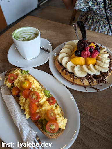 Avocado scramble toast was really good, same with the waffle. We enjoyed the drinks too. Service is kinda strange, when we arrived waitress came to our table and just stood staring at us like a prison guard for like 10 minutes, It seems like she had nothing to do because there were not so many customers, but I just don't like people staring at me like that. I also find it strange that they covered all socket plugs with duct tape, so no one could charge anything. The place isn't overcrowded, there were only a few people except us and I can't understand what is the problem with chargers, assuming all the coffee shops around have socket plugs and I can just go anywhere else to charge my laptop. After we finished our dishes, some incident at the kitchen happened and whole place started smelling awful, it felt like something was burnt and it wasn't comfortable to breathe. I mean really liked the food and coffee, but everything else wasn't good and I'm not sure if I will visit this...