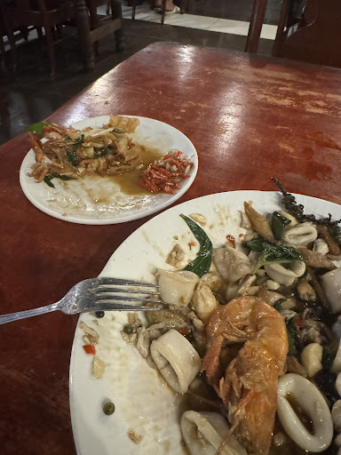 I ordered a papaya salad (which was okay), a smoothie (also okay), and for the main dish, I eventually chose the seafood stir-fry. I specifically asked for everything to be “not too spicy” — tourist spicy.