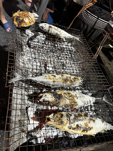 I had whole grilled fish that was sitting in salt and stuffed with lemongrass shoots. It was awesome! On the side i had shrimp and crab dumpling. So good. Also try the bbq skewers. About 10 BHT per stick with veg and meat options.
