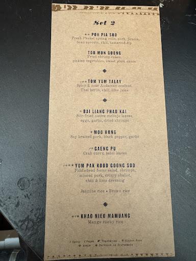 There were two tasting menus and they suggested the more costlier one. That was my plan anyway, but I must say, I have never been to an eatery that recommends the cheaper option. LOL. See my pictures for the tasting menu (for completeness, I have also included photos of their Ala Carte Menu). There were many elements that ruined my evening here. I was sitting outside and the humid heat was challenging. I had to ask for several cold towels and they were not willing to accommodate me inside an air conditioned enclosure, in spite of me repeatedly asking and being a solo diner. On top of that, they were clearly in a hurry to finish my tasting meal. That was very unsettling. Two appetizers came together in one bowl. The soup next and then, like four dishes came next. I asked why everything was brought all at once. Their reply was that because it was the main dish. Finally, the dessert. How can you savor every dish, for its temperature, texture, flavor and complexity if they arrive together? The appetizers were the best. Taste wise, I thought there was an overdose of lime in several other dishes. The overall food lacked uniqueness and oomph. Nothing much to write home about. One more thing, they charged me 270 Bhat ($7.50) for a glass of water and half a refill (no bottle on the table). Really? When it was all said and done, my check was around 2600 Bhat ($72). Money that could have clearly been better spent,...
