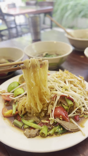 Read moreก๋วยเตี๋ยวมีให้เลือกหลายเส้นตามใจชอบ ปลุกความเป็นเชฟในตัวคุณ โดยการเลือกเส้น เล็ก ใหญ่ มาม่า วุ้นเส้น บะหมี่ และมีหมี่หยกให้ด้วย เราเลยเลือกหมี่หยกสิ ไม่ค่อยมีที่ไหนดี ตามด้วยเลือกว่าจะเอา แห้งหรือน้ำ หมู หรือเนื้อ อุปกรณ์ประกอบ ลูกชิ้น เนื้อสด เนื้อเปื่อย เครื่องใน สิ่งไรที่ชอบก็จัดมา อยากกินผักมีโหระพา ผักชีฝรั่ง และถั่วงอกให้ใส่ได้ตามใจเชฟ ตักเพิ่มเองได้ไม่อั้น ก๋วยเตี๋ยวที่นี่จะปรุงใส่พริกมาแล้ว ชิมก่อนเติม 4 จตุรเทพเพิ่มนะ เพราะเผ็ดใช้ได้เลยแหละ ก๋วยเตี๋ยวแห้งแอบรสชาติเหมือนนำจิ้มลูกชิ้น คือ ออกหวานๆ และเผ็ดๆ ถูกใจไม่ถูกใจ เชฟสามารถปรุงเพิ่มเองได้เลย