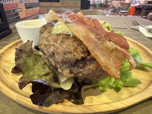 5/2024 Update: The Perfect classic burger. Still my favorite for classic style burgers. “Carnivore Burger” (300 grams. Perfect ratio of lean and fat). Served with crispy bacon , caramelized onions, tomato and lettuce. Thick and juicy. Always cooked to a perfect “Medium”(see photos). Best bargain in town(275 bahts).