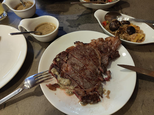 Семье в первую очередь не понравились цены, и что когда заканчивается дневное меню, или что там за акция: нельзя примерно понять, сколько грамм будет весить тот или иной стейк примерно, а цена указана за 100 грамм. При этом тех стейков, которые есть в дневном меню в основном нету, и их намного меньше (я напомню, они специализируются как стейк-хаус, а там на выбор от силы 6-8 стейков разных отрубов). Во вторых когда мы выбирали, у нас вообще не спросили прожарку, и когда фициантка уже ушла на кухню, я успела крикнуть "medium rare", и я не уверена, что она услышала). В итоге эти умные люди принесли нам всем какую-то дичь с прожаркой, всем 🤬. (написала ниже о ней) Конечно же членам семьи, которые не едят такую же прожарку что и я, были серьезно возмущены. Маме было особенно обидно из-за прожарки, и вероятно, противно. У них на выбор было 3 соуса в комбо: трюфельный (единственный наверное вкусный), перечный (по факту просто горчица. 🙂), и кисло-сладкий (мы не брали, это ещё и странное сочетание для меня лично). Когда я начала есть свой стейк мало того, что он был явно горячее 60 С°, что уже говорит о том, что они не доводят его о готовности, он ещё был как ботинок. Серьезно, можно было ЗУБЫ ВЫРЫВАТЬ ИМ!!! Я попробовала Фланк с "перечным", поняла, что реально вкус выдержки слабый, и тяжеловато жевать тоже. При этом степень прожарки была то пережаренной (Well done++), то rare. Как так можно было умудриться, когда в день они делают минимум стейков 15 (я столько же за жизнь готовила), в Фланк стейке не помню, были ли проблемы с случайной прожаркой, но она была ближе к Blue rare (похоже они не знают о том, что из-за горизонтальных волокон стейк нужно жарить дольше. 🙂👊💖) Нью-Йорк 65-75 дней выдержки (не помню точный срок) за 600+ батт, Фланк 40-45 дней за 300-400+ батт. Кому интересно, откром по вкусу был зерновой или травяной, которые меньше всего вкуса дают. Эх, а надеялась на то, что смогу выбрать кукурузный...