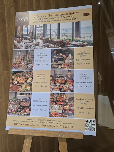If I 0 star rating is available, I would have rate this at 0 star! The 1 star is only for the staff who gave good service. This is by far the worst over priced hotel buffet I had ever eaten in my entire life from a 5 star hotel. For the price, the food selection absolute is garbage quality. The same price range buffet in Hong Kong would have hot/cold lobsters, different varieties of crabs, crayfishes, Japanese sashimi/sushi such as Tuna, Hokkaido Scallops, Ika, Maguro Akami, Chu Toro, Herring etc., Ribeye or Sirloin or New York steak, large varieties of cold cut like Parma Ham/Iberico Ham and varieties of cheese, expensive hot dishes and soup etc. (Hong Kong rent and labor cost is many many times of Thailand) Hilton buffet only had shrimps, cheap shells and Fine De Caire oysters (rotten). Unfortunately, the oysters were not fresh, in fact stink! My wife tried the 1st one and stopped immediately, I had a few and ran into at least 2 stunk ones too so I stopped since I don't want to get food poisoning. There were 3 type of Sashimi, Tuna, Salmon and fishy Mackerel, all were improperly thaw out so they were basically tasteless as the umami flavor had drained away with the water. There were different low quality sushi made from the same low quality improperly thaw out fishes. The only beef available was cheap quality shoe leather tough rump cut, pork chops. The cold cut varieties were few, just three and the Parma Ham is so hard/dry/salty which made them unedible. The only edible item from this area was the smoke salmon. The low quality made to order hot noodle was worse than the local 50 baht street vendor variety, only minced chicken/pork or pork meatballs topping were available; from a upscale hotel like this one would expect the soup would not be a street vendor quality MSG soup! The dessert selection was very few too. The ice cream was served in a white rice bowl, an absolute lack of attention to detail for a hotel of this class! There was nothing good about this buffet offered from a high class hotel. One can get much much higher quality food from Haru for 1/2 the price 700 baht or Kazuhiro minus the ocean view. But one can't get full on ocean view! Hilton Edge's price is very expensive for locals and yet the quality of food served is the worst I ever had compared to the hotels I stayed in Hong Kong, Japan, Asia, USA,...