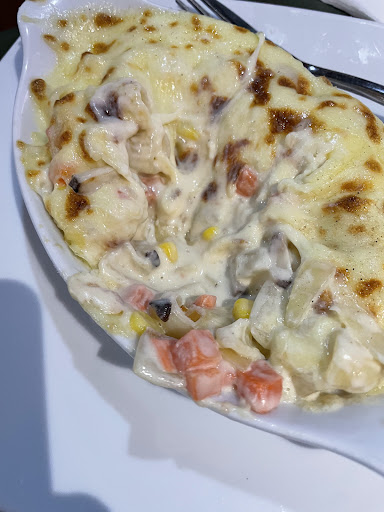 It was my first time going here. I ordered garlic bread, baked Mac and cheese and a beer. The beer was good. The garlic bread had uncooked, raw, crunchy garlic on it and the bread was barely toasted. The Mac and cheese was full of carrots, raw onions, and corn. It was bland and even with lots of salt and pepper tasted like I was eating paper with uncooked bits in it. The photos are actually of their “baked Mac and cheese”