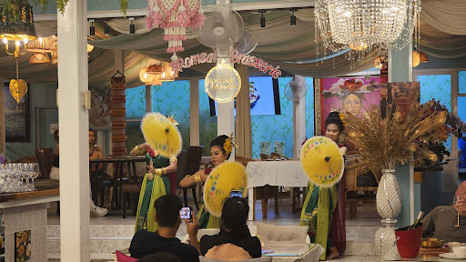 Inside, Romsai Brasserie truly impresses. Downstairs, you'll find an enormous dining area serving authentic Thai cuisine, alongside delicious French food at "Le Paris." Upstairs, a large, air-conditioned room bursts with color from beautiful paintings and traditional parasols, creating a vibrant atmosphere. This versatile space is a hub for entertainment, hosting lively Salsa nights on Tuesdays, Thursdays, and Saturdays, as well as Karaoke sung in various languages.
