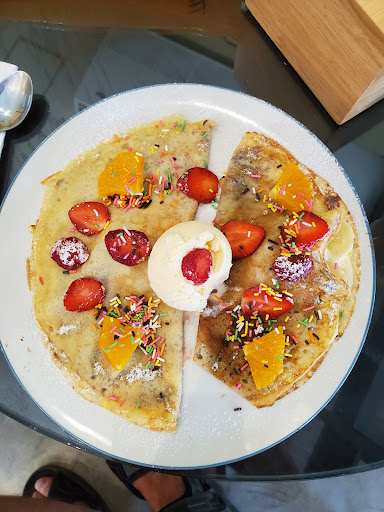 On the first day I tried the pancake with fruit and a green milk tea. Three pancakes with honey, some cream and lots of fruit around them. I also had a passion fruit smoothie, which I also found very tasty. All smoothies are made from fresh fruit.