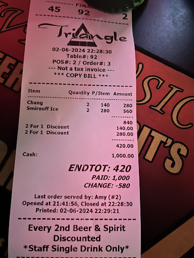 I've never eaten there, but often go for the drinks, vibe, and live music. After over a dozen years in SE Asia, a single night here is one of my fondest memories. Soi Buakhow was raised to accommodate traffic during monsoon season. Unfortunately that means Buakhow is a dam to any nearby road east of it. And Triangle Bar is a dozen or so meters east of soi Buakhow. Sois 23 and 25 merge at rge wester side of the bar (hence the Triangle). The bar itself is raised: floods occur annually. So we all were high and dry. The band stopped playing at midnight, but The Triangle served drinks until 0200, and at 0145 they announced that we (quite a packed crowd) could stay on, but needed to order and buy booze before 0200. Since the Triangle was an island in the floodwater, it was packed full of fabulous folks. I chatted with a Welshman from Cardiff, two Scots from Aberdeen, a Brazilian from Rio, and a tres chic 80-year old Vietnamese woman from French Indochina days. About 0400 the waters were down to knee-high, so I waded over to Buakhow and my hotel, with a dozen other Trianglers (wouldn't you know it, motorbikes drove west at fairly fast speeds creating chest-high waves left and right into the pedestrian waders). I've traveled all over the world, and that night at the Triangle Bar was one of the most memorable in my life. Since then, I've taken numerous American and Thai friends to the Triangle. The live bands are great; the staff are great; the management on that monsoon night was greatest of all. Shame on me for not reviewing the Triangle Bar years ago. Everyone I've ever introduced to the Triangle has loved the place, and returned to Triangle whenever they return to Pattaya. (I've never dined there, so I can't review their food.) NOTES: prices are quite reasonable; but wheel-chair accessibility is dodgy at best, because you have to get several feet above soi-level. I spent well over 500 on that memorable flood night, but normally about 300 or 400 baht max. The zero rating for food is because I've never...