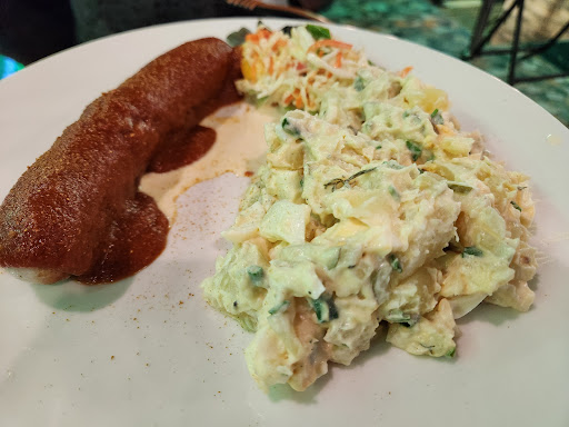 Like others have noted, the German menu is tiny here (half the size of the Thai menu). But the staples are there. And we were lucky to get the Rouladen on special. And oh man, that was good! And good value for ฿395. On the other hand, the Currywurst was not impressive, and not a great value at ฿245. The sauce was way too sweet. I guess the owner has a sweet tooth, because they also serve the sweetest ketchup on earth -- Roza! It's like red colored sugar, and it's like ฿2 cheaper than proper Heinz ketchup. Other pros: good potato salad, and big portion sizes. Other cons: the place is hot, they only serve Thai beer on draft, and they only accept cash. And the "kartoffelpuree" tastes more like American mashed potatoes instead of the traditional German style whipped potatoes, but it's OK, and the "potato soup" was...