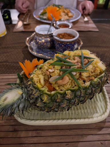 I had roasted pineapple rice with chicken (strictly speaking not on the menu) and my partner had Phad Thai. Both excellent. The manager came by later, and suggested a sauce to add, which I did (no extra cost.) Best meal so far.