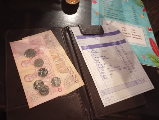 The rain had mostly stopped by 6pm, just in time for dinner (this was July in Thailand, so definitely in the "rainy season") . Dinner was a challenge. We initially went to BBeen (amazing place), the same restaurant we went to on first night, but they closed because no one came (because of rain). Then we tried to get a Grab to the Khaolak night market (which had numerous restaurants), but the road was flooded so no driver accepted. Then we went to lobby and Jume talked to hotel concierge about "Pam" a fancy restaurant. They mis-heard Jume, because we wanted to go to Phen (located on the North side of the Khaolak Marriott). So we walked to Phen. It was so slow... And they mis-heard our request for spring rolls and instead brought us chicken Satay. We kept the Satay and also reordered our spring rolls.... Turns out the Satay was so much better than the spring rolls which were almost all wrapper. The peanut sauce for the Satay was "to die for".