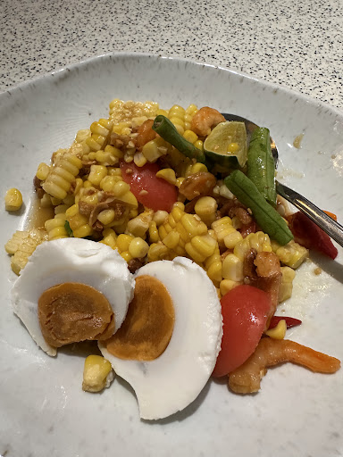 🌿 Sweet Corn With Salted Egg Fresh sweet corn with tangy citrus sauce balanced with saltiness from the salted egg which is a must to go with. (I don’t recommend squeezing the lime which will make the dish too sour)