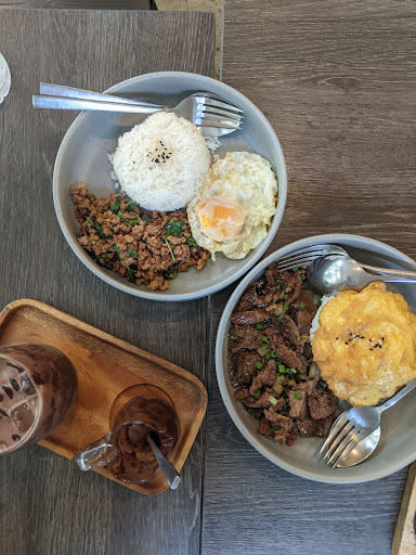 I decided to go to this cafe as it was featured in one of the local online articles, but it turned out to be quite a disappoinment - due to (1) unfriendly service from the staff, and (2) low hygiene standards. -First off, the cafe is run by self-service. Order at the counter and come pick up the food yourself. I got the "Stir-fried Pork & Basil with rice (Krapao Moo)", "Angus beef on rice", Ham & Cheese croissant and some drinks. In regards to the taste, both food was just average (nothing special really). You can find dishes with the same taste from elsewhere or even from street food stalls. Drinks were slightly better, specifically for the chocolate drink. Notably, none of the staff were friendly, to the point you feel bad for "bothering" them. Asked for 3 small plates for sharing, and got plates with a small bug, and some sesame seeds remaining stuck. Told the staff about it, and she did not apologize or show any surprised or concerned reaction at all. And was simply asking "So you came to return them? Or want new plates?". Being in the F&B, genuine or not, at least you got to show some level of professionalism and empathy to customers...