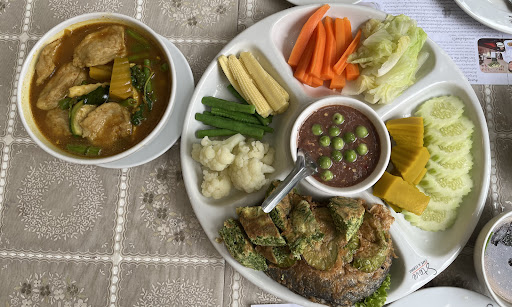 🍽️ The Food? An Absolute Standout. We tried their classic Thai spread: a vibrant Nam Prik Kapi (shrimp paste chili dip) with a colorful array of fresh and blanched vegetables, crispy cha-om omelette, and perfectly fried fish. Paired with a bowl of bold, tangy Gaeng Som packed with fish, young vegetables, and spice — it was a full-on flavor celebration.