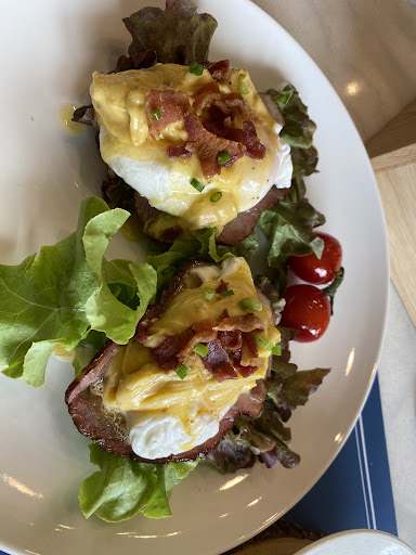 Eggs Benedict was very attractively plated with lettuce and two lightly roasted cherry tomatoes. Yolks were runny, whites cooked, and the ham was mild. The hollandaise sauce was made with mayonnaise which gave it a strong mayonnaise taste I did not care for. It was still very good though. Bacon can be substituted for ham.