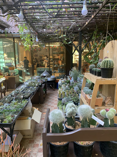 The restaurant is a bit old. It is an open space and there are various types of tables indoors and outdoors. The ceiling is high.
