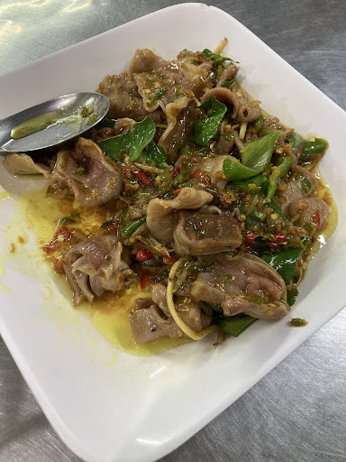 I had deep fried mantis shrimps. A staff informed that mantis shrimps are 800 bahts per kilogram including its shell. I had stirred fried sea brass stomachs with vegetables and spicy sauce 180 bahts, stirred fried crab meat with vegetables and curry powder 250 bahts, sour and salty fish with soup 220 bahts, sweet, salty and sour seafood 160 bahts, stirred fried squid with shrimp paste 160 bahts, stirred fried egg with melinjo leaves 80 bahts, omelette with crab meat 100 bahts กั้งทอดกระเทียม กั้ง กก ละ 800...