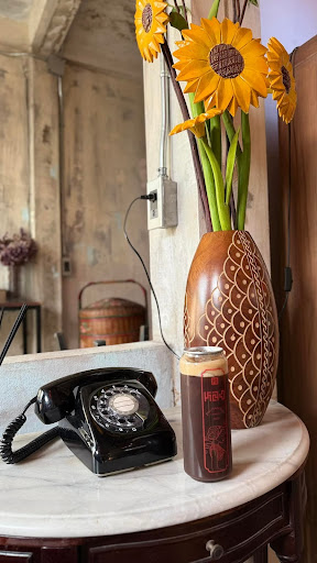 บรรยากาศร้าน จากศาลเจ้ารีโนเวทปรับเปลี่ยนจากเดิมมาเป็นคาเฟ่ที่ดูน่าหลงไหล และดูมีมนต์ขลัง น่าเกรงขาม เป็นคาเฟ่สไตล์จีนร่วมสมัยที่ดูมีสันสดใส ภายใต้แนวคิด “การสร้างบริบทพื้นที่ให้กลับมาสวยงามอีกครั้ง” โดยยังคงโครงสร้างและอัตลักษณ์ของศาลเจ้าเอาไว้ โดยไฮไลต์ภาพผู้หญิงขนาดใหญ่สวมกี่เพ้าถือกาน้ำชาที่วาดเด่นหราอยู่กลางร้าน ท่ามกลางแนวผนังโชว์อิฐเปลือยเป็นช่วงๆ