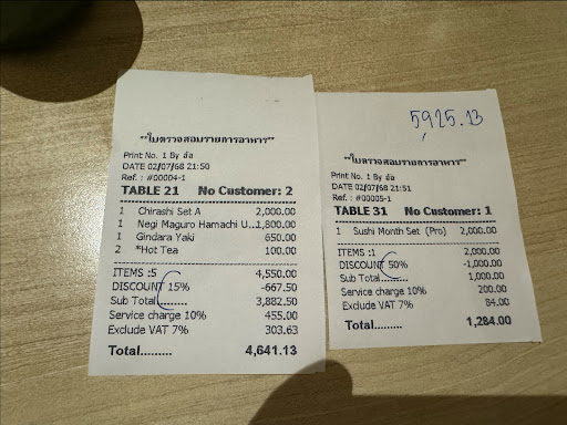 Spend your hard earned money in another Japanese restaurant. The sea urchin (uni) smelled and tasted horrible - signs of not fresh uni. I haven’t tasted uni that bad for a long time. The shrimp and scallop also clearly had freshness issues. The sizes of the chirashi are big but what does it matter when the ingredients are poor. Lastly the way they calculate service charge is a blatant scam!!! They take the original price and multiply with service charge 10% to get the most money out of you before applying the discount on their promotion. See picture for how it was calculated. No where in thailand or in the world is it calculated like this.