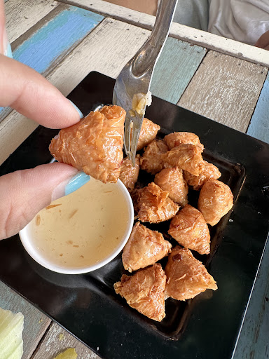 แปปเดียวน้องเดินเอาเกี๊ยวทอดมาให้ 20บาทถือว่าให้เยอะ น่าจะทอดใหม่ กรอบดี มีน้ำจิ้มให้ด้วย ชอบเลย(ในรูปกินไปครึ่งนึงแล้ว เยอะมั้ยล่ะ)