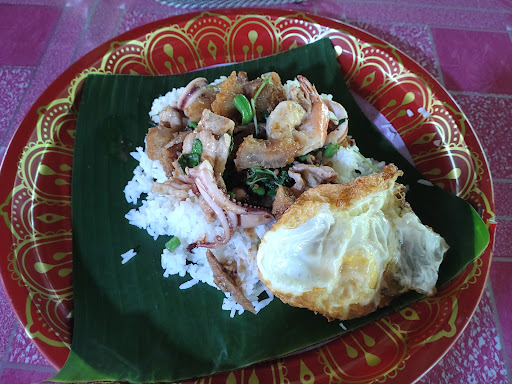 "Restaurace" samotná je v podstatě malé stavení u cesty, pokud sem pojedete autem, je určitě kde zaparkovat. Uvnitř je docela dost stolů, vývěsní tabule a malá kuchyň. Nic dalšího ani není potřeba. Obsluha v podstatě neumí anglicky a nabídka je pouze v thajštině a bez obrázků, ale s Google foto překladačem si to zvládne přečíst asi každý, takže objednání trvá jenom pár chvil. V nabídce je v podstatě jenom Pad Kaphrao, v různých variantách podle masa, které si vyberete. Zajímavá je určitě ta z divočáka, ale mě zaujalo vepřové s mořskými plody. Vejce se objednává zvlášť, základní objednávka je vždy bez něj.