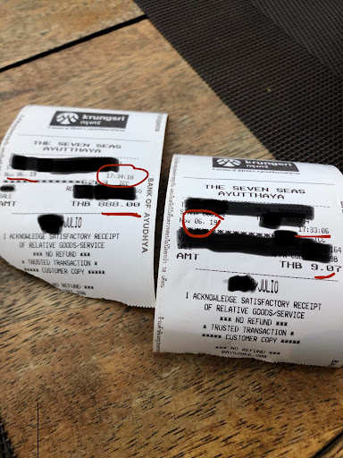 Supposedly something happened that he/they did the math wrong, but when i checked at the bill and what we ordered it did not equate to the sum of the two bills. :\ if it happens to you please call them out, for such a small amount I lost faith in Ayutthaya (only for that...