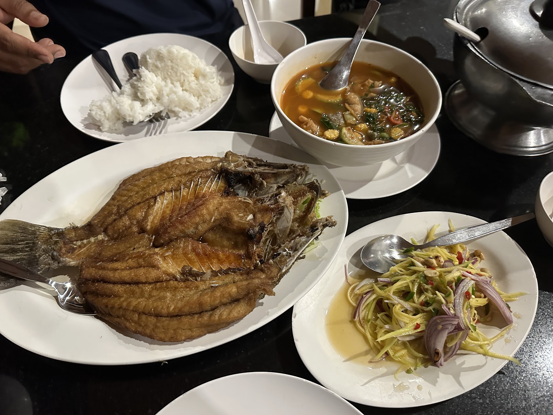 Read moreมาทำธุระแถวนี้ แวะหาอาหารเย็น มาเจอร้านนี้พอดี มาสามคนจะสั่งปลากะพงนึ่งมะนาว ทางร้านแจ้งว่าเหลือแต่ปลาไซซ์ใหญ่นะคะ ราคาจะต่างจากในเมนูนิดหน่อย (ในเมนู 299 แต่อันนี้ 359) เราก็กลัวจะกินไม่หมดเลยสั่งเป็นปลากะพงทอดน้ำปลา กินไม่หมดจะได้ห่อกลับง่ายหน่อย แต่พอปลามาเสิร์ฟคืออิหยังวะมาก คือที่นี่เขาเรียกว่าไซซ์ใหญ่แล้วหรอ มันก็ไซซ์ปกตินี่นา ไซซ์ปกติตามเมนูคือตัวจะเล็กกว่านี้? อิหยังวะอันที่สองคือ เมนูยำตะไคร้กุ้ง ทั้งจานมีกุ้งตัวเล็กๆอยู่ 2 ตัวมาสามคนแบ่งกันยังไงก่อน น่าเกลียดมากบอกเลย ควรปรับปริมาณอาหารให้เหมาะสมกว่านี้ ส่วนราคาจะคิดเท่าไหร่ก็คิดไปสิ อันนี้น่าจะเรียกยำตะไคร้หมูสับใส่กุ้งมากกว่า รสชาติก็กลางๆเหมือนที่รีวิวก่อนๆบอกไว้ แต่บรรยากาศดีเพราะอยู่ริมน้ำ ไปค่ำแล้วเลยไม่เห็นวิวแม่น้ำเลย...