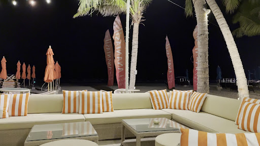 Ambiance - lovely! Live music (good singer), gentle breeze, feet in the sand (we were seated outdoors), white lights strung between trees, kids flying kites by the water (despite being dark).