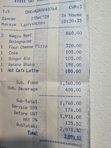 Read moreI mean, you really can’t get a better view of the beach at Hua Hin while dining. Some might match it, but I don’t think anyone can beat it. It is fabulous. The service is top-notch. Super friendly and very attentive. I was very happy to leave a tip in this instance. It was well-deserved. The complimentary sourdough bread and butter was very good. I love sourdough. We also really thought highly of our calamari appetizer. I love calamari and almost always try it when I see it on the menu of a new restaurant. This is the second best calamari I have had in my almost five years of living in Hua Hin. The pizza I had was pretty good. It was just a pepperoni, but nice flavor and crust. Nothing life changing by any means, but it was a solid pizza. I heated up the other half the next day and it was a little below average, which was too bad. I usually enjoy a pizza even more the next day when I heat it up. My better half got a salmon pasta that she said was just ok. She only ate a little bit and took the rest home. She ate it the next day and said that she did not really enjoy it. We only had waters and soft drinks. The check came to about 2,100 baht, which is a bit pricey, but the view and atmosphere make it somewhat worth it. There is an extensive menu and I would certainly come back to explore it more. This is a...