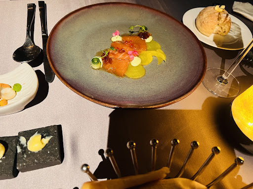 As it lightly drizzled outside, we enjoyed being indoors, watching the sky change from soft blue to deep navy—truly a calming and memorable setting. The hotel staff were incredibly kind and accommodating. Even though we weren’t hotel guests, they kindly offered buggy transport to and from the restaurant, which was a thoughtful touch.