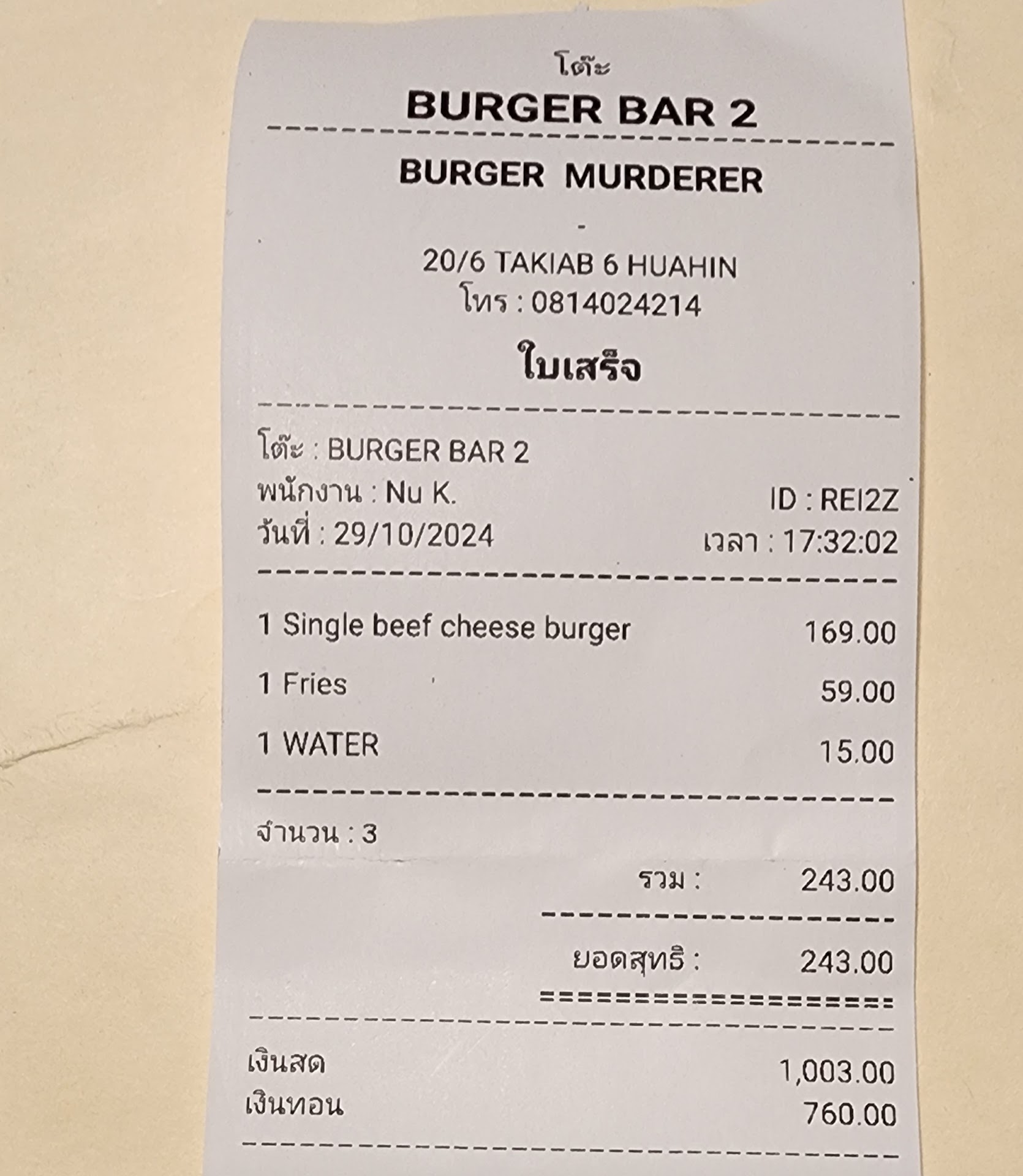 Read moreDelicious, delicious, delicious. This rivals the best burgers I've had in Thailand ! Appealing from the moment it was served. As the saying goes " A Diamond in the Rough " / Update ; return May 1 ,2024 and " Neu " owner is at again ! By far the best Angus double bacon cheese onion burger on an artisan bun w/ lettuce. I left off the tomatoes and mayo. The double is a major meal ! Artistic looking , aromatic , bursting with flavor , prepared Masterfully. None better and I have had many other burgers throughout Thailand some very good. This is the Pinnacle ! The one that ranks above all others , thanks again Neu , I will see you again this week..Fries were great , you have all the right condiments and even bbq sauce ! Great work in the Kitchen...
