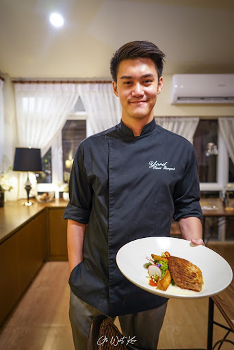 เมนูของทางร้านจะมีทั้งแบบ set course และ a lar carte ครับ โดย set เมนูจะมี 4 course ให้เราเลือก main dish ได้ รายละเอียดดูในภาพเมนูด้านในได้ครับ ส่วนตัวผมได้ลองแบบ a lar carte โดยเริ่มจาก ‘Clam & Potatoes soups with Toasted Bread and Clam Ragout’ ( ซุปหอยตลับ เสิร์ฟพร้อม ขนมปังกรอบหน้าหอยตลับผัดเนยกระเทียม ) ซุปหอยตลับสูตรทางร้านร้อน ๆ หอม ๆ เสิร์ฟมา พร้อมหอยผัดกระเทีมรสชาติดีบนขนมปังกรอบชิ้นใหญ่ ทานแล้วเข้ากันมาก ‘Pop Shrimps’ ( กุ้งทะเลชุบแป้งทอดกับวาซาบิมายองเนส ) appetizer อีกจานที่เป็นกุ้งทอดพอดีคำ ทอดกรอบกับซอสวาซาบิมายองเนสตัดเลี่ยนได้อย่างดี กลิ่นวาซาบิน้อยไม่ฉุนทานง่ายครับ ‘Pasta Chinese Sausage & Mushroom’ พาสต้าผัดกระเทียม พริกแก้ง ใส่ กุนเชียงและเห็ดออรินจิ พาสต้าฟิวชันที่มีกุนเชียงเป็นเนื้อหลัก แต่กลับเข้ากันได้ดีกับรสเค็มเผ็ดน้อย ๆ ของกระเทียมและพริกแห้ง พร้อมเห็ดออรินจิ อร่อยมากครับ ‘Wild Seabass, Green Pea Puree, sauté seasonal vegetables Fish Velouté ’ จานเมนของผมเป็น เสต๊กปลากระพงหนังกรอบ กับครีมซอสสูตรพิเศษของทางร้านที่ตีมาเป็นโฟม พร้อมพูรีถั่ว ให้ความรู้สึกมัน ๆทานคู่กันไป ปลาหนังกรอบดีงาม ทานกับซอสแล้วลงตัว จานจัดสวยมากครับ แต่ละเมนูเชฟยอด เจ้าของร้านได้ออกมาแนะนำแต่ละส่วนให้ฟังด้วยดีเลย