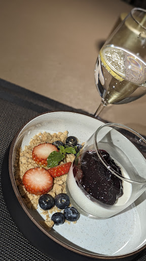 Why this restaurant isn't a Michelin star potential I don't know. The food is outstanding, the wait staff competent and capable, the menu is appealing, and the view great. Wow I was blown away. I started with the pan seared sea bass. With a creamy foam, a type of mushroom I've never had, and the fish was perfectly cooked with a crispy skin that is hard to achieve. I loved it so much I just had to try something different. Next a duck salad with crispy skin. It was quite good and beautiful too. Next a pannacotta with berries. Not to sweet, but the berry compote was enough to take it to the next level. Wine pairing was a Pinot Gris nice and crisp and an Australian Chardonnay that I enjoyed. These were the house wines and quite good. A sparkling water with lemon was a nice addition. All in all a fantastic dining experience. Didn't expect to...