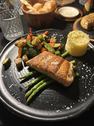 My go-to dish is the salmon, and it’s consistently excellent. The fish is cooked perfectly every time — tender inside with a light crisp on the outside — and seasoned with herbs, olive oil, and a hint of lemon that makes the flavors pop. The sides, like roasted vegetables and fresh salads, always feel vibrant and healthy, not just filler.