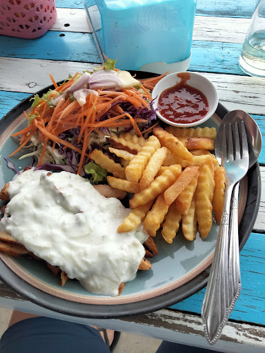 Great meal here recently. We had the chicken kebab meat with a delicious dressing, salad and my favourite crinkle cut chips. Friendly service and looking over the water. Lots of flies unfortunately but the owner doesn't ask...
