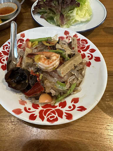 Koran noodles (I think pad Thai basically). Really flavorful spicy sour tamarind chicken soup which they accommodated leaving the chili out but isuaing all the herbs seasonings and other spices So delicious and basic fried rice both of us have been having tummy issues so we were cautious about spices this time so didn’t try the real isSan spice unfortunately, also pandan and lemongrass drink delicious although too sweet for me Nice of them to let me try small sip first and not have to leave behind a whole drink. Thank you for a...