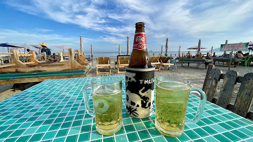 This is a great relaxed place on the beach with sun loungers to hire, tables and chairs and a menu of seafood and drinks. The guy serving us was really friendly and welcoming and delivered everything super quick. Beers were really cold (120 Baht for a large) and a bucket of ice was free!! They also served big glasses of wine, we didn’t get it, but two westerners were tucking into several glasses so it must’ve been ok! We had Spicey Shrimp & baby sweetcorn with rice (150 baht) and delicious big Thai fish cakes (120 Baht). Food was great for the price and setting and we like supporting local families and their businesses. Great place to relax and watch the sun go down over the...
