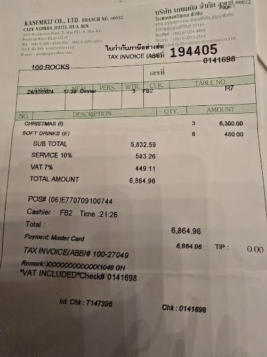 24th December 2024 As far as I am concerned, Cape Nihdra is the best hotel in Hua Hin From the moment you enter, you are taken care of and the staff do their utmost to make sure you have a good time. Each time I have visited, this attention to detail and customer care has not wavered. Tonight we attended the Christmas Eve dinner and the spread was fantastic. So much choice and all of high quality. The ribeye was particularly good. Service was flawless and Ruang, Fon, Bua, Tonga, Sub et al did not stop all night. Very hard working and attentive staff. There was bubbly and cocktails on the lawn for the hour preceding the meal with a violin duet playing Christmas tunes in the background. It was perfect and I cannot recommend Cape Nihdra and the Rocks Restaurant highly...