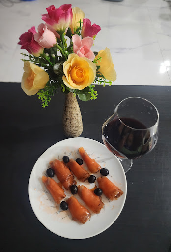 Salmon House Soi 102 offers a variety of appetizers, from sashimi to tuna salad. For the main course, you can try their homemade ravioli, which is filled— of course - with salmon. The ravioli is one of the highlights of the menu, as it is made from scratch and has a delicate texture. Another option is the fettuccine with salmon and mushrooms, which is a hearty and satisfying dish. The pasta is cooked al dente and the sauce is rich and creamy. Also for the main course, you can choose from different types of salmon steaks, such as grilled, baked, or poached. The steaks are served with a side of mixed vegetables that are sautéed to perfection. The vegetables are diced and have a crunchy texture that complements the softness of the fish. The plate is garnished with a sprig of dill and a small bowl of white sauce that adds some moisture and flavor to the dish.