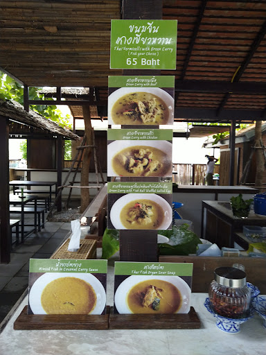 The food here is know as kanom jeen, which is a traditional style Thai curry with white rice noodles. We had the green curry beef and chicken. Both were bursting with flavour. You can select all side dish vegetables and pickles vegetables + you can take one boiled egg each as part of the meal. We also had tord man pla which is a fried fish in batter with some vegetables which is shared with a sweet and spicy chili sauce which was delicious. All the food here is organic, fresh and very tasty. Only negative is that there were not always people at their stations so there was a bit of a wait but they were...