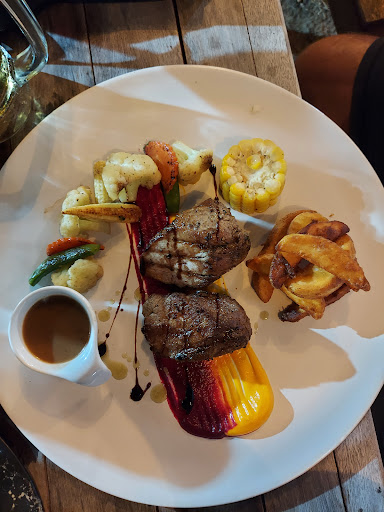 Bei unserem heutigen Besuch waren wir Abend etwas essen und haben herrlich drauÃen am Brunnen gesessen. Zum Fleisch gab es sogar ein GlÃĪschen Rotwein aufs Haus. Das Kotelett war zart und das Schweinefleisch sehr lecker, das GemÞse dazu bissfest. Beide Gerichte waren toll angerichtet. Preise sehr angemessen.