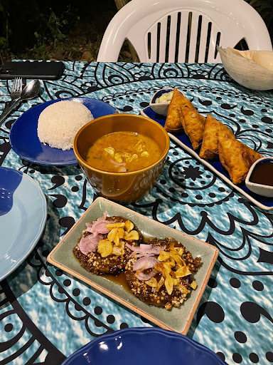 We had an incredible Indian dinner at the Blue Owl. The samosas are a perfect starter and come with chutney and Joghurt. The Lamb Rogan was super tasty and not too spicy while the chicken madras had a real kick to it. The service was super attentive and friendly and we were even offered anti mosquito repellent which was super thoughtful. Would definitely recommend to go here, oh and if youâre an iced tea lover get the iced hibiscus tea...