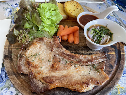This place serves nice prepared and cooked western dishes but they have for European people maybe a bit too much of a Thai taste. The pork shop came like many we have seen in Thailand with too much of fat and was cut too thin opposite of the bone. Straight cut seems difficult for many local butchers and only possible if the meat is frozen. The grilled chicken on top of the mashed potato’s was delicious but the sauce underneath in our opinion too strong. The third meal we ordered was Spaghetti Kee Maow Tale in hope it would have a bit of a Thai taste but it came with too much black pepper and a mix of cream sauce mixed with oyster sauce. It was rich of seafood but the sauce was unfortunately making it too bad. The Salad is super fresh as expected and we liked the large fresh shrimps. We recommend this place to try the large menu and buy fresh hydroponic vegetables ready to take home. Next time we come and taste the dessert buffet and might buy the salad basket for our...