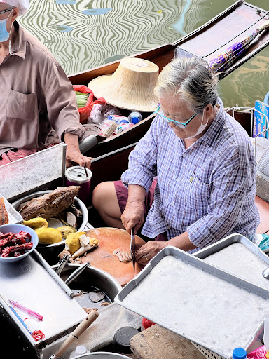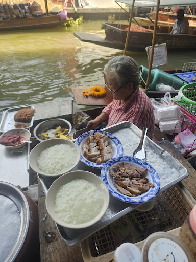Read moreข้าวต้ม กับข้าวอร่อย มีให้เลือกทั้ง หมูกรอบ หมูแดง เป็ด ไก่ ไส้ กับน้ำจิ้มรสเด็ด ป้าแกนั่งในเรือคอยหั่นใส่จาน นั่งกับพื้น ได้ลมพัดเย็นๆ ติดริมคลองชมเรือหางยาวพานักท่องเที่ยวชมคลองดำเนินสะดวก สัญจรผ่านไปผ่านมามันช่างได้ฟิวแท้ๆ ใครไม่สะดวกนั่งพื้นด้านล่างก้อมีโต๊ะให้นั่งด้านบนนะ บริการดีเป็นกันเอง ราคาไม่แพง ผมกินกับข้าว 3 จาน กับข้าวต้ม 2 ถ้วย 115 บาทถือว่าโอเคร...